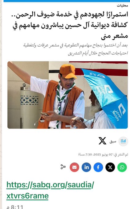 ضمن أنشطتها المجتمعية الهادفة، نفّذت ديوانية آل حسين التاريخية نشاطًا ميدانيًا مميزًا من خلال مشاركة فريقها الكشفي في خدمة حجاج بيت الله الحرام خلال موسم الحج، وذلك بالتنسيق مع جمعية الكشافة العربية السعودية، وتحت إشراف مباشر من القائد الكشفي علي بن عبدالعزيز العلي.